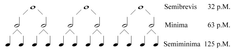 Ungerader 3er Takt: Im Dreiertakt ist die Brevis in 3 Semibreves unterteilt, dadurch wird die Dauer der unteren Stufen um ein Drittel verkürzt. Im Laufe des 17. Jahrhunderts wurde das ganze System einer Diminution (Verkleinerung) unterzogen, indem als ganzer Takt die Semibrevis definiert wurde, daher auch der Name „ganze Note” - das Grundtempo bleibt sich aber gleich, rutschte einfach auf die nächsttiefere Stufe (also von der Brevis auf die Semibrevis, die nun „ganze Note” heisst, von der ganzen Note auf die halbe usw.).